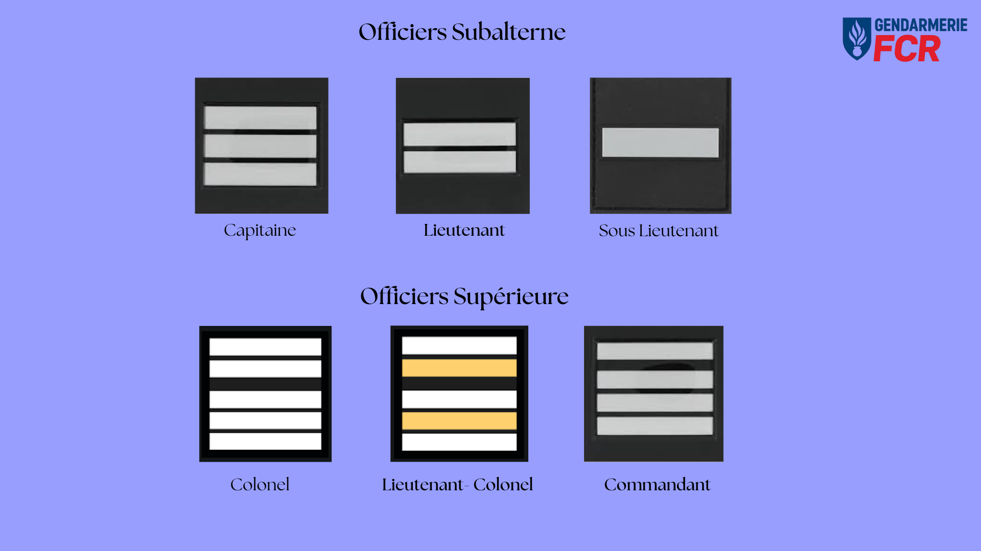 ➡ Sous-lieutenant (OffS SLT) Commande une unité de gendarmes Participe aux décisions opérationnelles Encadre les sous-officiers et adjoints